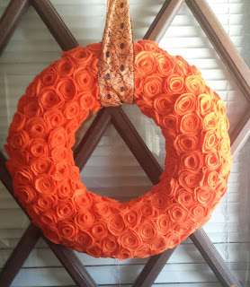 Orange handmade felt rosettes. The Halloween ribbon is not attached and can be changed. Although, that is the ribbon on the reverse side of wreath, but who will see that other side. This could be great all throughout the fall months.